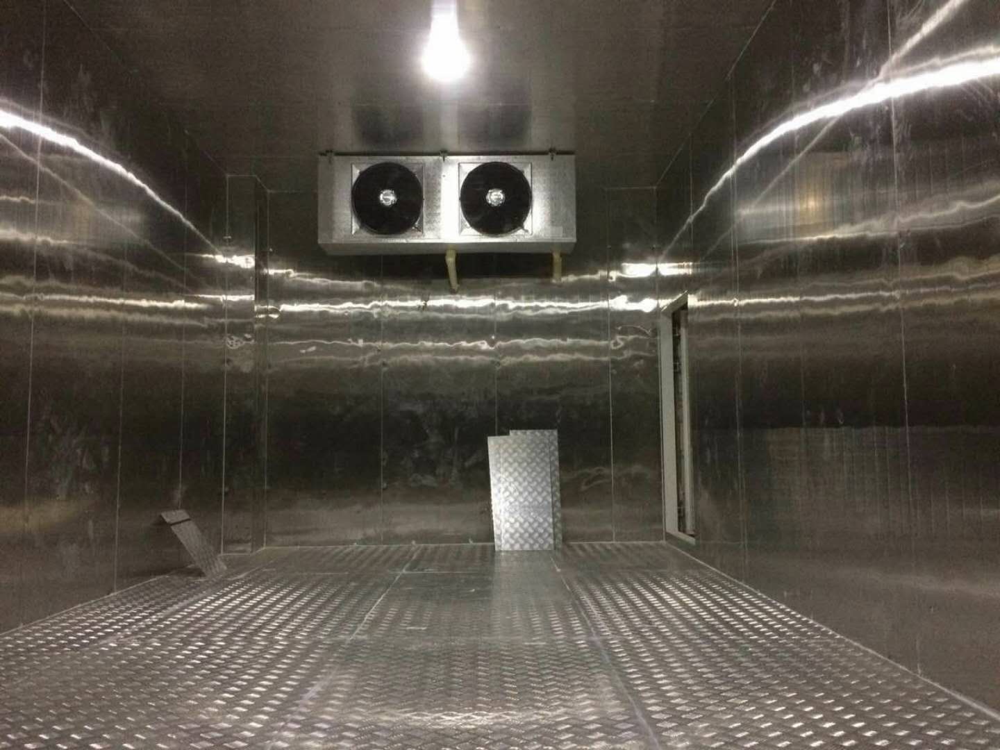 庫體采用雙面不銹鋼15cm聚氨酯冷庫板,機(jī)組采用北京比澤爾20匹雙級(jí)水冷機(jī)組,